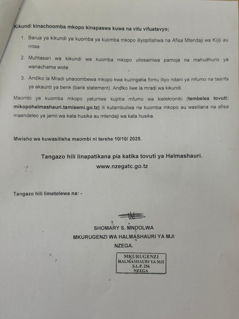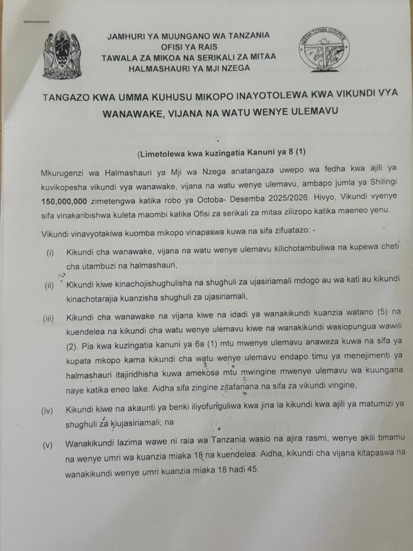 TANGAZO LA MIKOPO INAYOTOLEWA KWA VIKUNDI VYA WANAWAKE,VIJANA NA WATU WENYE ULEMAVU